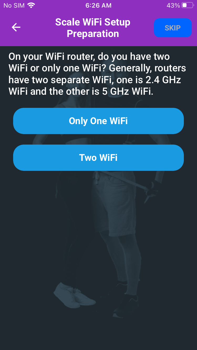 Through phone Settings connect your smart phone to the WiFi network to which you want to connect your scale. Please note the WiFi must be 2.4 GHz WiFi, it should NOT be 5 GHz WiFi. If you have only one WiFi network showing in the list of available WiFi that belongs to you and your phone is already connected to that WiFi you are all set (For example, Fig. WiFi Settings shows two WiFi).